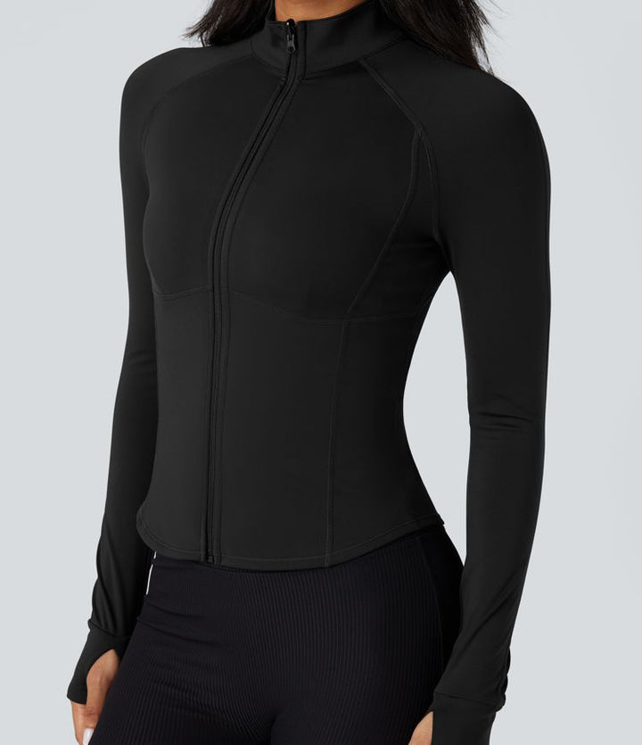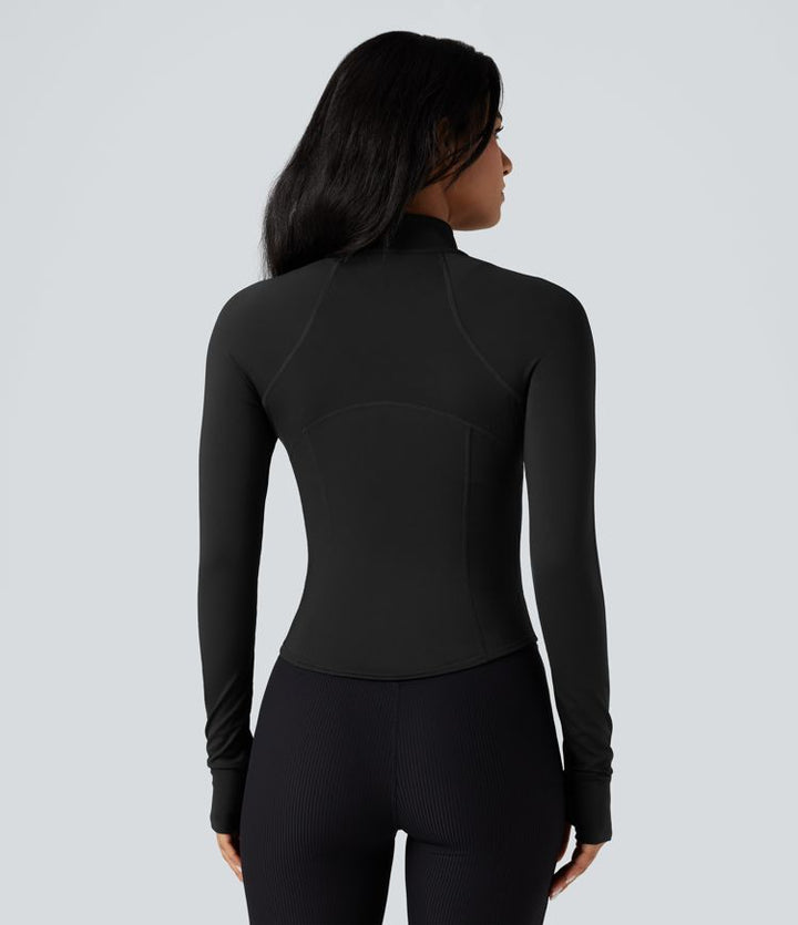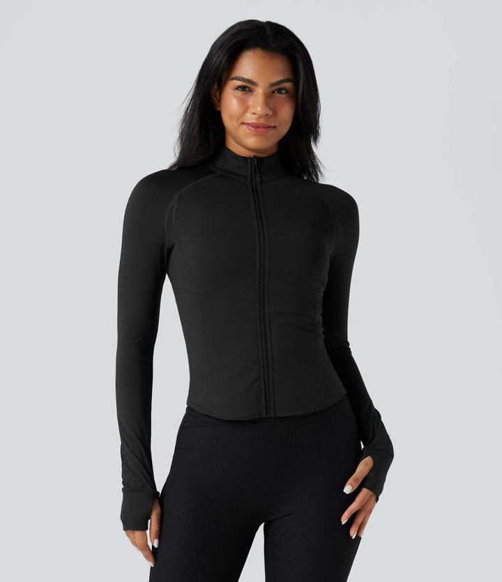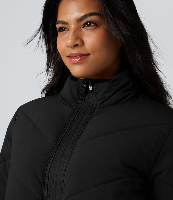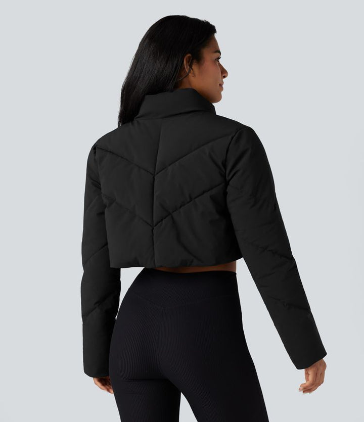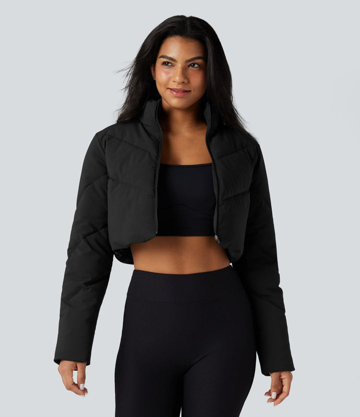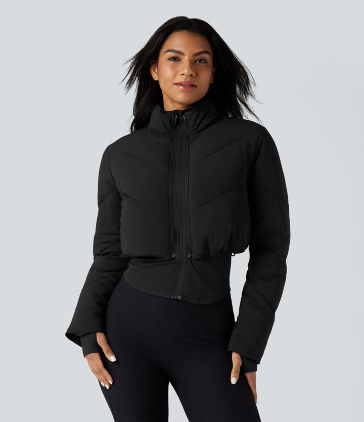 3-in-1 Stand Collar Casual Cropped Puffer Coat & Thumb Holes Curved Hem Jacket with Pocket